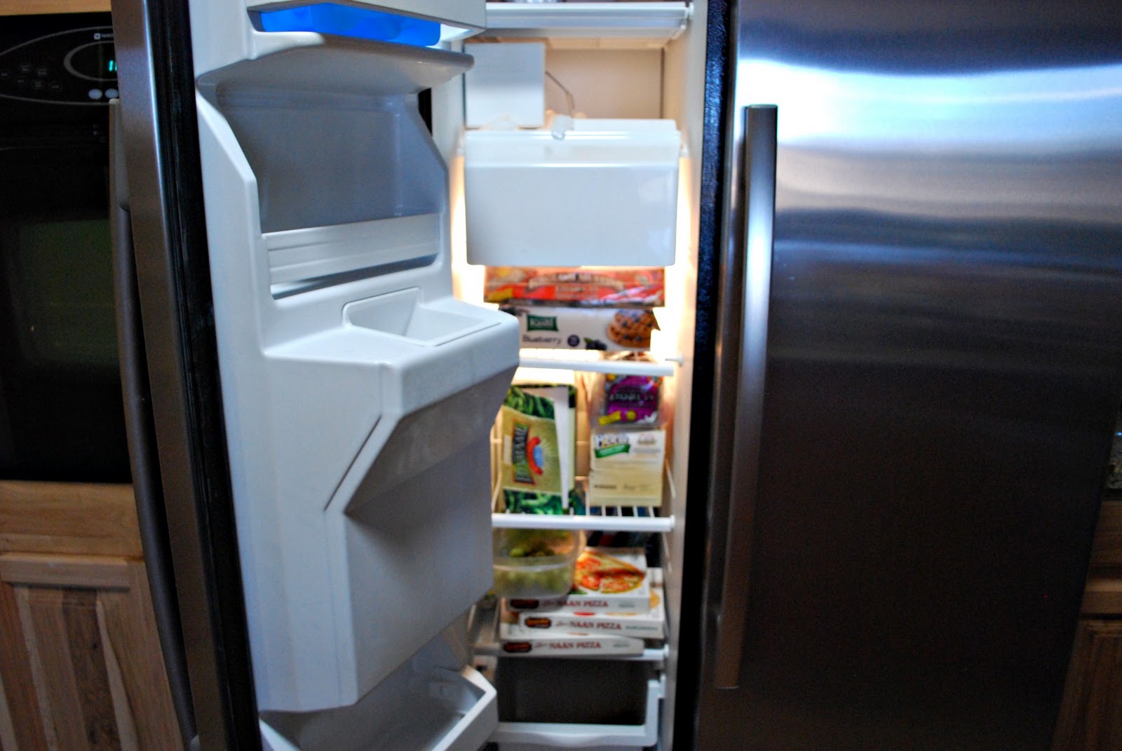 Freezer shelf 1: Ezekial English muffins, Kashi blueberry waffles
